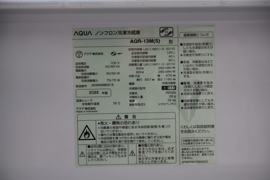 AQUA AQR-13M 126L 2ドア冷蔵庫 2022年製。 (税込) 21780円。