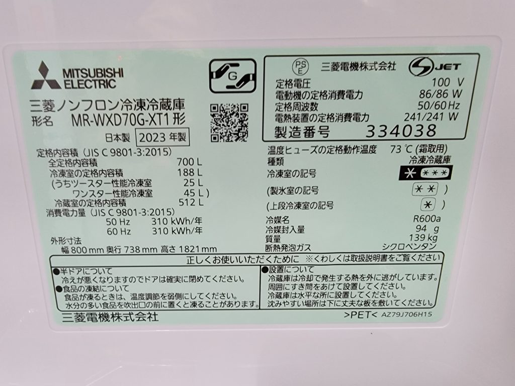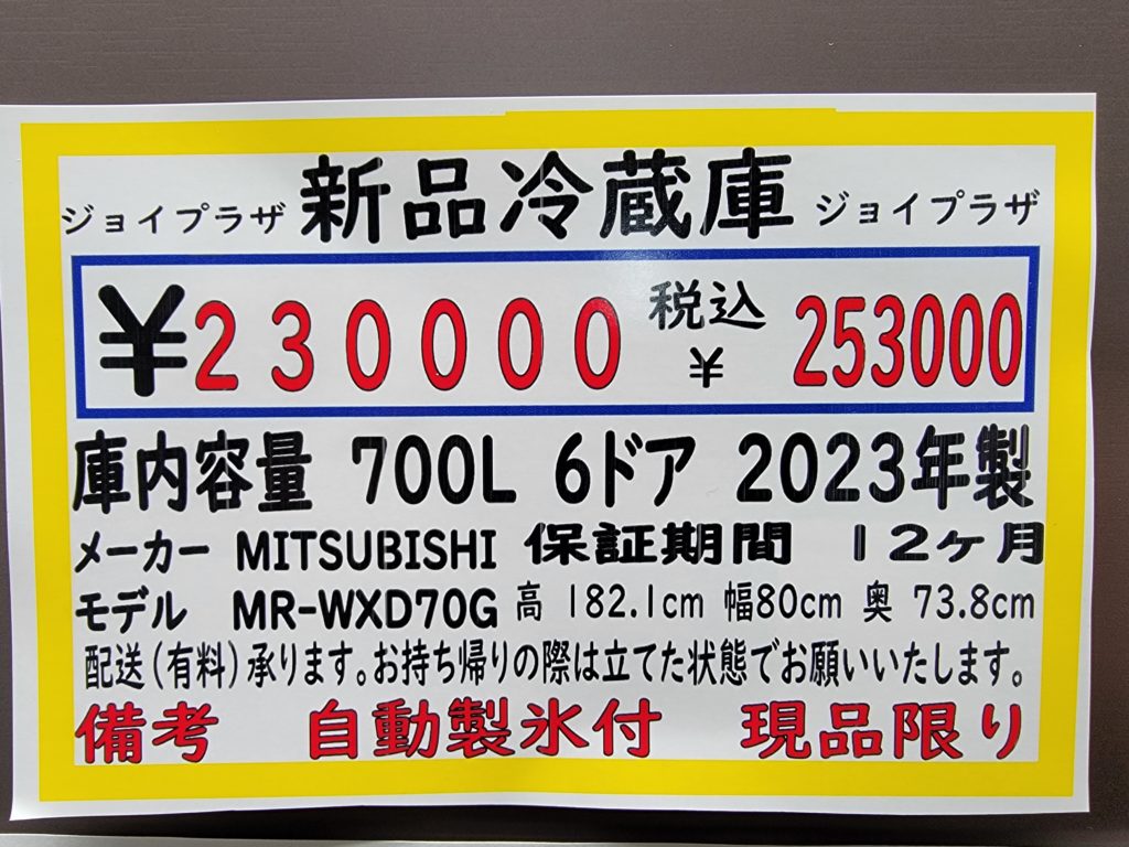 家庭用の大型冷蔵庫が入荷しました。その容量はなんと700Lです。