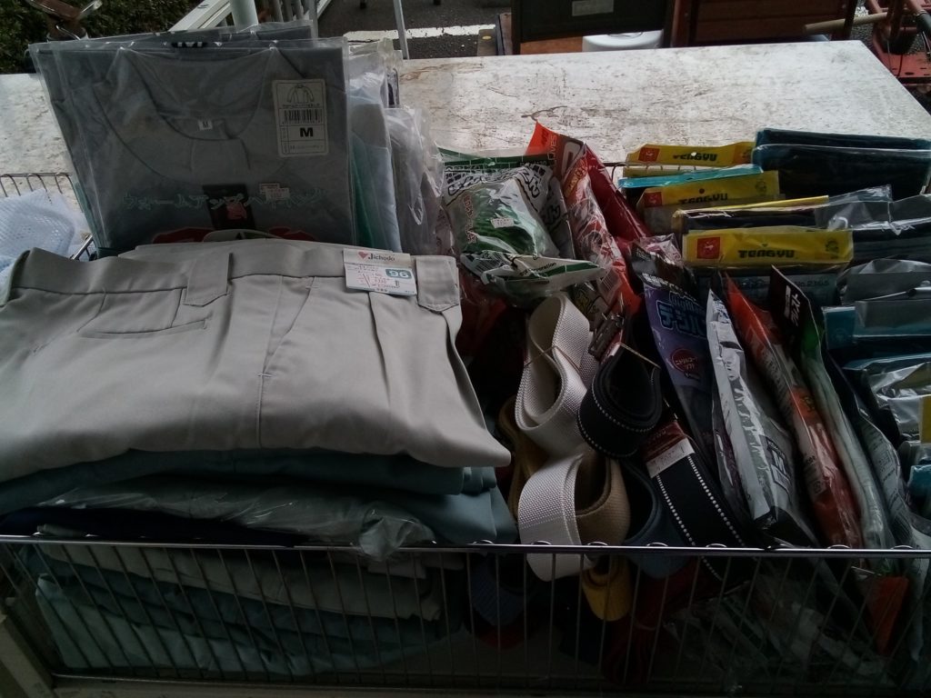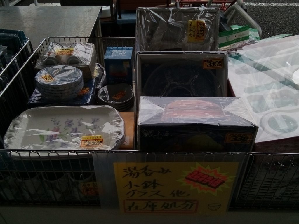 店頭でワゴンセールを開催中です。 バッグは300円均一、食器は格安、衣類は詰め放題500円です。 作業着も格安です。