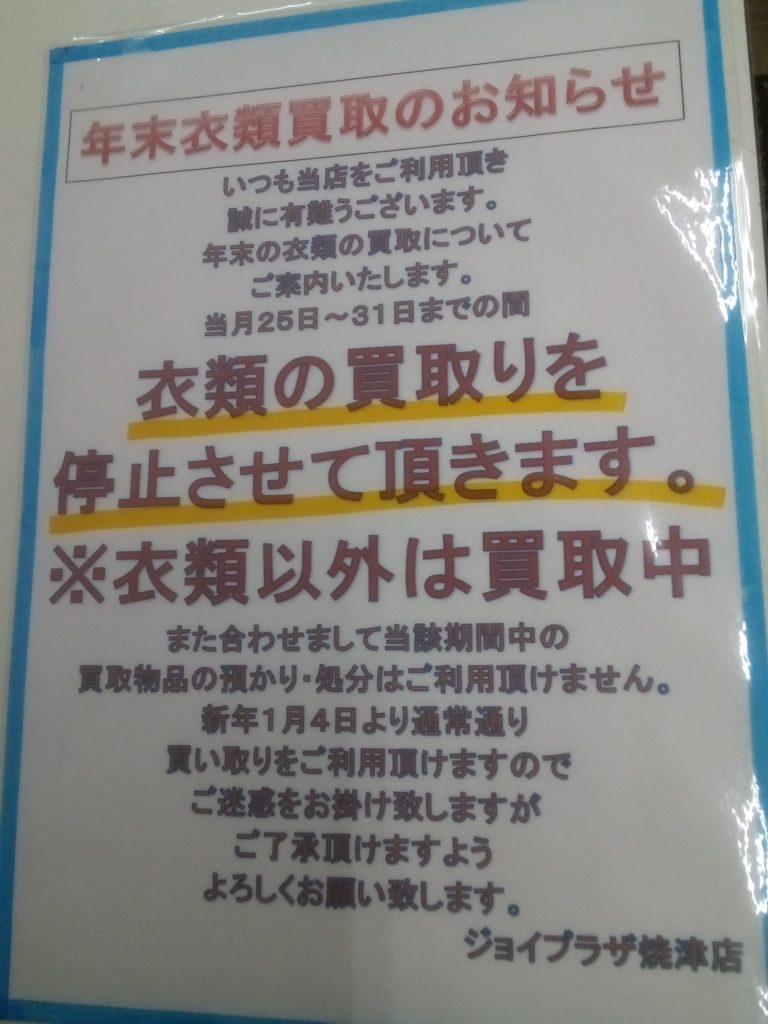新年1月4日より通常通り衣類買取を再開の予定となりますのでご了承頂けますようよろしくお願いします。